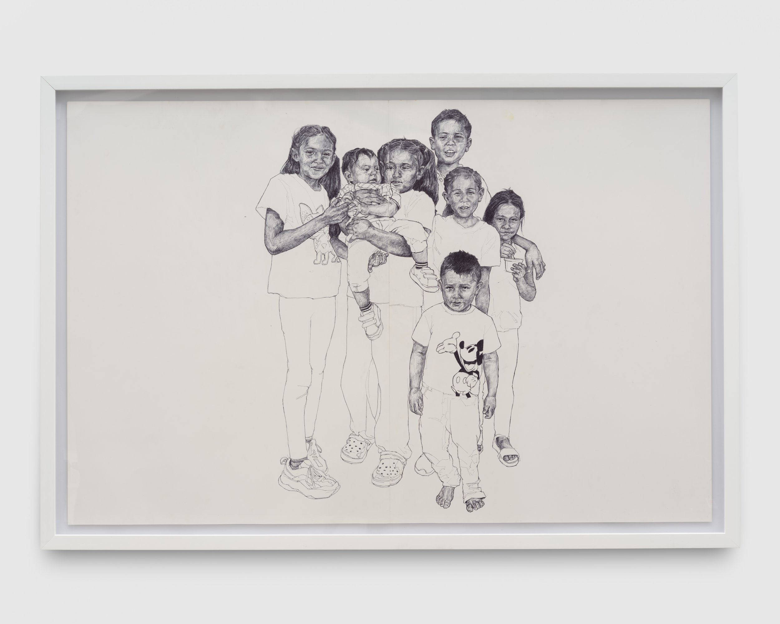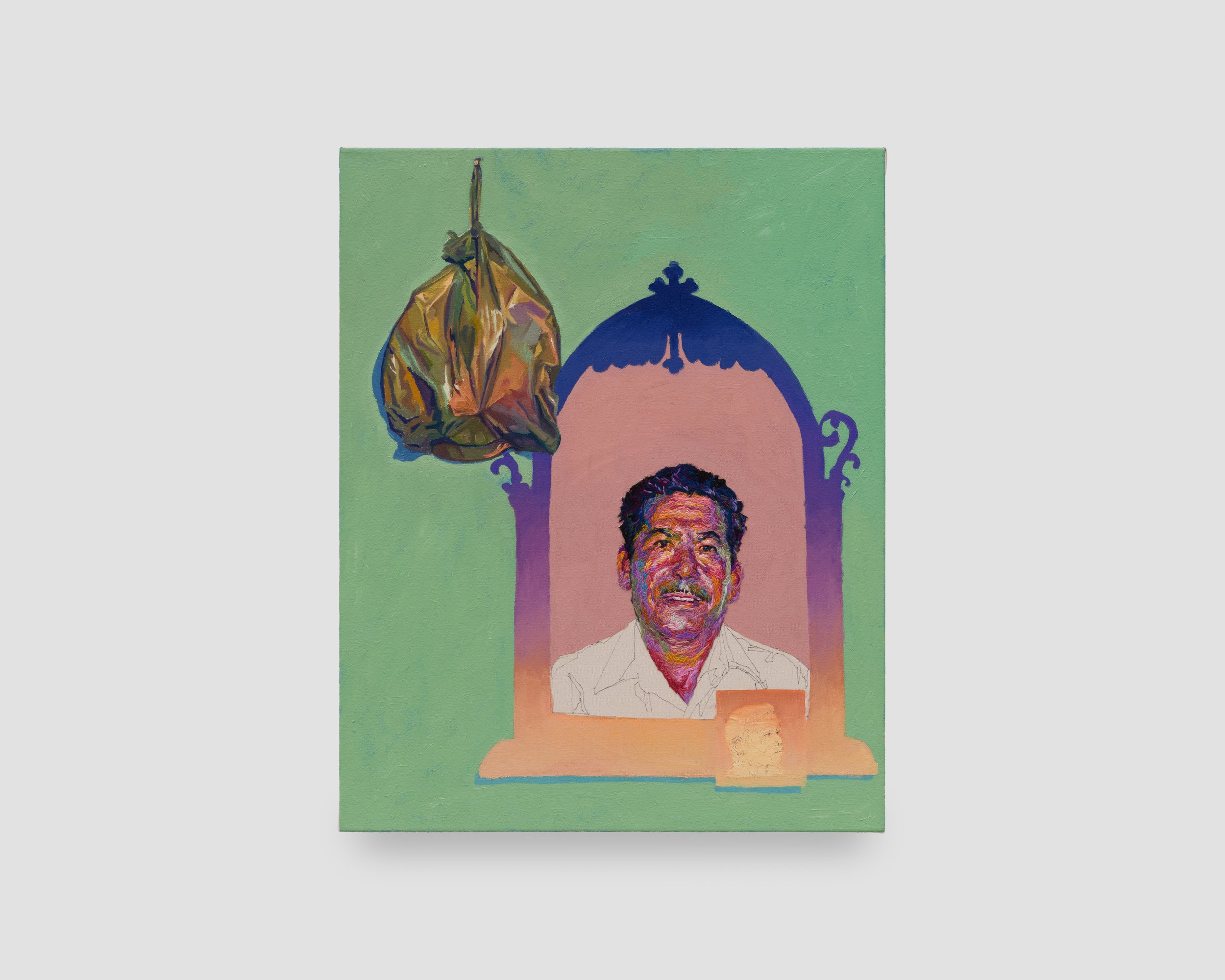 The vibrant yet enigmatic High Noon is based on a snapshot from a family wedding. The dusty flat expanse and vibrant blue skies of the high desert stretch behind the group, all of whom pose stoically for the viewer’s gaze. In place of the sun, a pre-Columbian coyote howling whistle floats in the dense sky – a souvenir from the Temple of the Sun outside of Mexico City. The spectre of the coyote stalks through several works in the exhibition, often watching over the youngest members of the family and serving as a reminder of the family’s immigrant history. In 2nd Generation, one of the few strict paintings of the group, a silhouetted coyote overlays a portrait of a young boy. The coyote is a vibrant red-orange that, because of its precise tone, all but disappears when viewed in black and white. The family’s Mexican roots grow weaker as each generation inevitably becomes more assimilated – tradition loses potency until it is almost imperceptible, yet never fully disappears.
