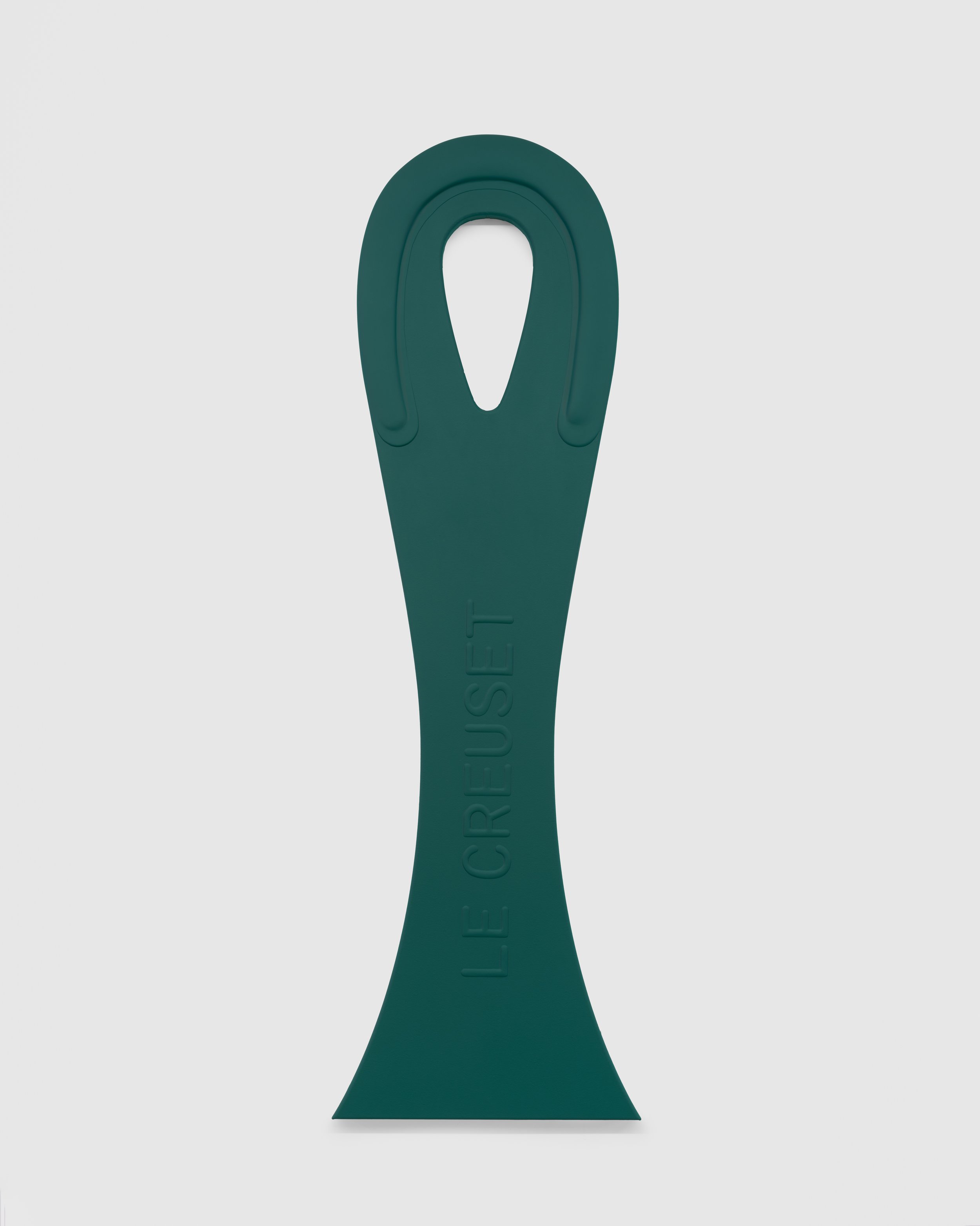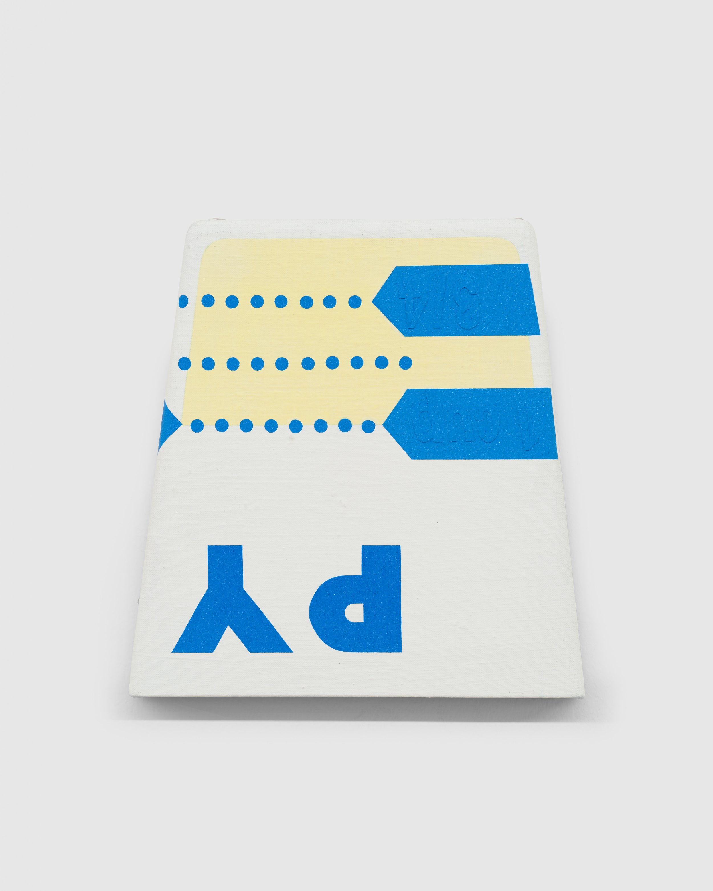 Raos pushes his use of shaped canvas and embossed detail to new heights in Untitled (Out of options). The painting takes its shape and color from the iconic Le Creuset frying pan, its raised rounded edge painstakingly recreated in layer after layer of built-up paint. The French brand is a luxury in any kitchen, and that the model for this work came from the artist’s own is a symbol of how far he’s come since his childhood, when it wouldn’t be unusual to find someone cooking drugs in the family kitchen. Raos found escape in art, and inspiration everywhere: from the aspirational bravado of 90s rap to the bright, flat colors of signage and commercial packaging to bits of trash fished off the streets. Techniques honed over years of self-taught practice have coalesced into a robust and singular vernacular confident enough to plumb this very personal material with polished élan.