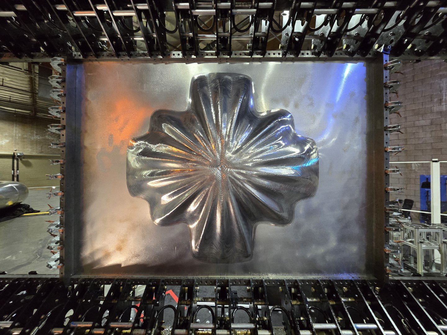 The centerpiece of the exhibition is the large wall-based sculpture AI and the Anvil, in which small, intricate waves ripple across a vast metal surface. With this work, Reben explores the realm of directly converting language into tangible sculpture. Using the giant metal-forming robots of Machina Labs, Reben iteratively collaborates with an AI that autonomously generates code that creates generative 3D sculptures as instructions for massive robotic systems. This enables the robots to sculpt sheet metal into artworks with remarkable precision in a way impossible with other fabrication methods. Reben describes the performative nature of the sculpture’s making as akin to a high-pressure tango, where each machine must move in precisely the opposite direction of the other to balance the immense forces required to manipulate metal. This poetic movement not only reflects the intricacies of their physical interaction but also embodies the delicate dance of creation itself.