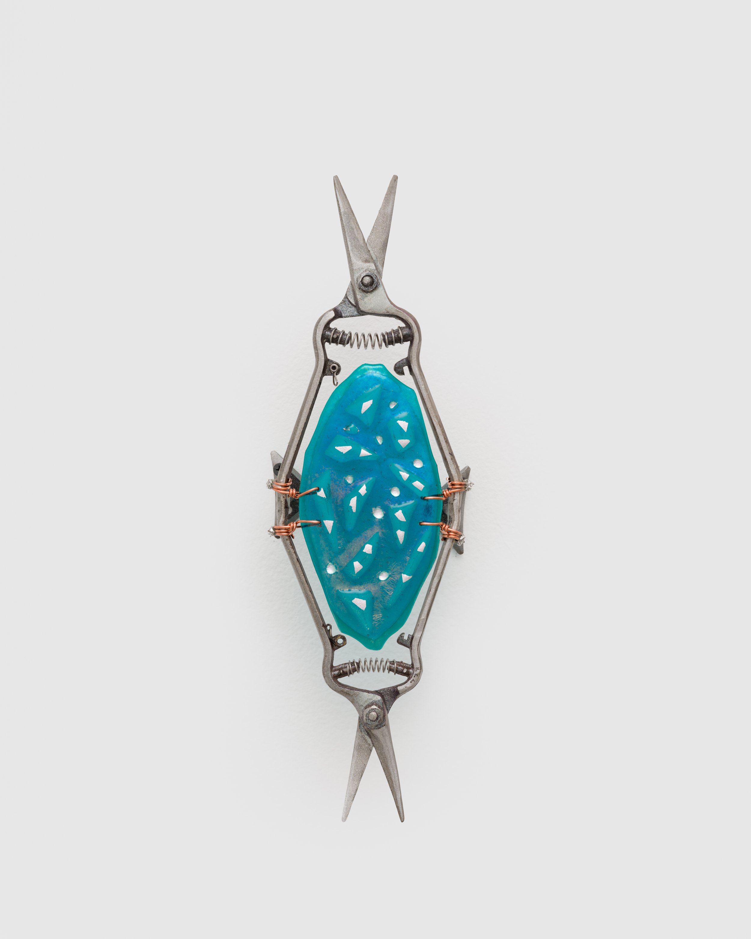 Throughout the gallery hang three Freedom Portals, works from the Windows into Heaven (2023) series that offers conduits to another world, or perhaps another worldview. Small pruning shears have been fused together to create enclosed interiors that hold collaged dichroic glass forms that resemble both the infinite stretch of deep space and the humble paddle of a cactus. A hazy boundary between the cosmic and the ordinary characterizes much of olivas’ work, their edges intentionally blurred. Elsewhere in the gallery, an everyday five-gallon bucket formed from terracotta clay holds a gently bubbling fountain, its cool waters encouraging calm and coolness in a heated time and a call to the ancestors who spring from the cool waters.