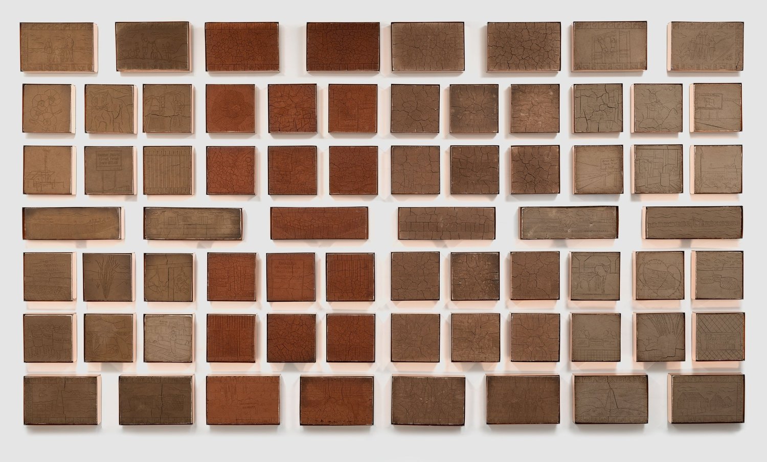 Amézquita developed the process for her soil paintings over much trial and error, and must adapt it to best suit each new soil – works in the exhibition integrate soils from California, Arizona, New Mexico, and Texas. The finished surface is a mix of soil, masa, and rainwater; onto which Amézquita draws with a simple incised line reminiscent of pre-Columbian glyphs and writing systems. The paintings are then frozen, baked, limewashed, and framed in thin strips of copper. Working in this way allows Amézquita to connect with the land literally, but also places her work within an ancestral tradition of symbolic storytelling that stretches back to carved Mayan writing.